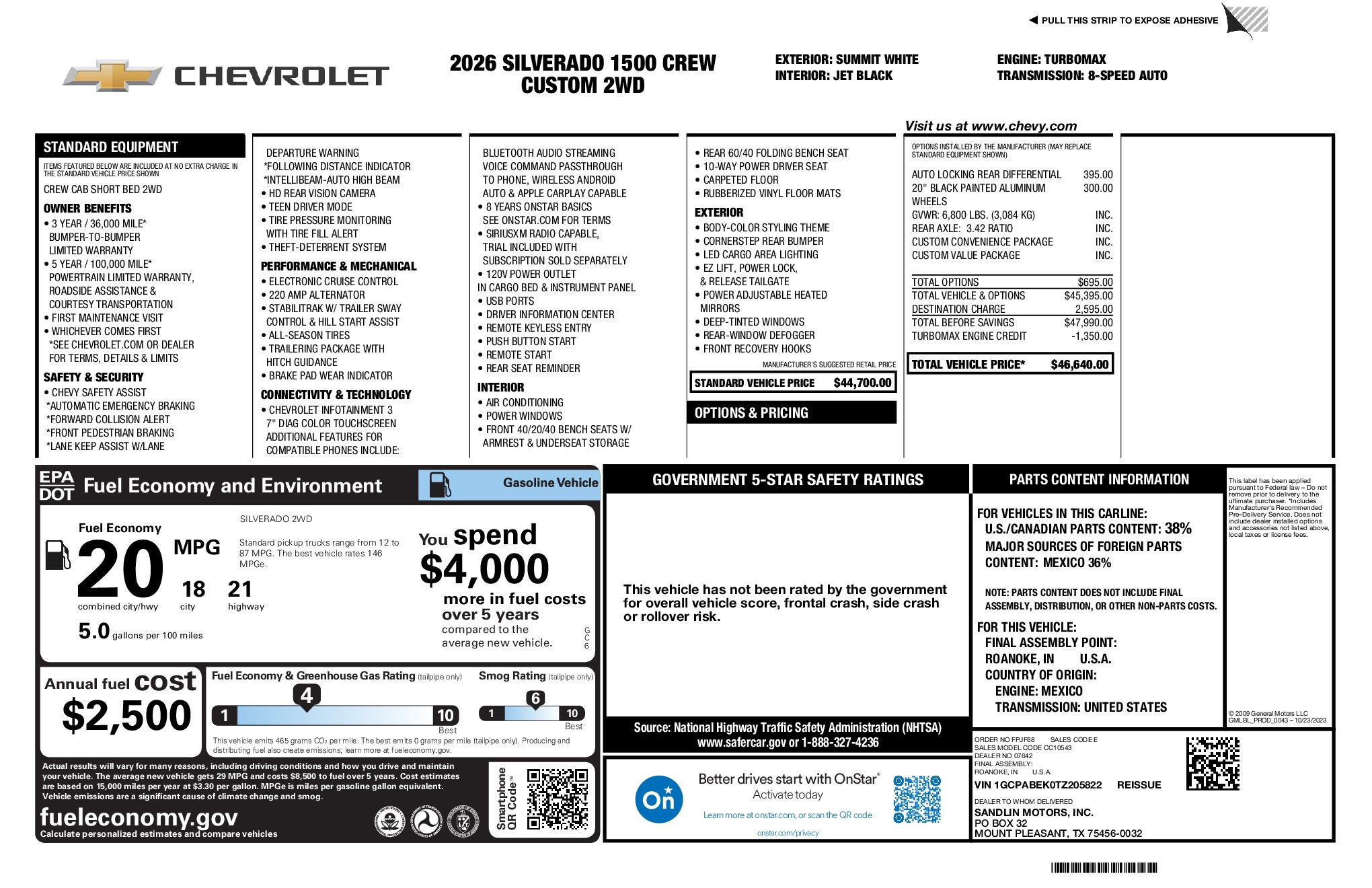 Chevrolet 2026 Silverado 1500 Custom 2.7L I4 Turbocharged DOHC 16V LEV3-SULEV30 310hp RWD 8-Speed Automatic Summit White