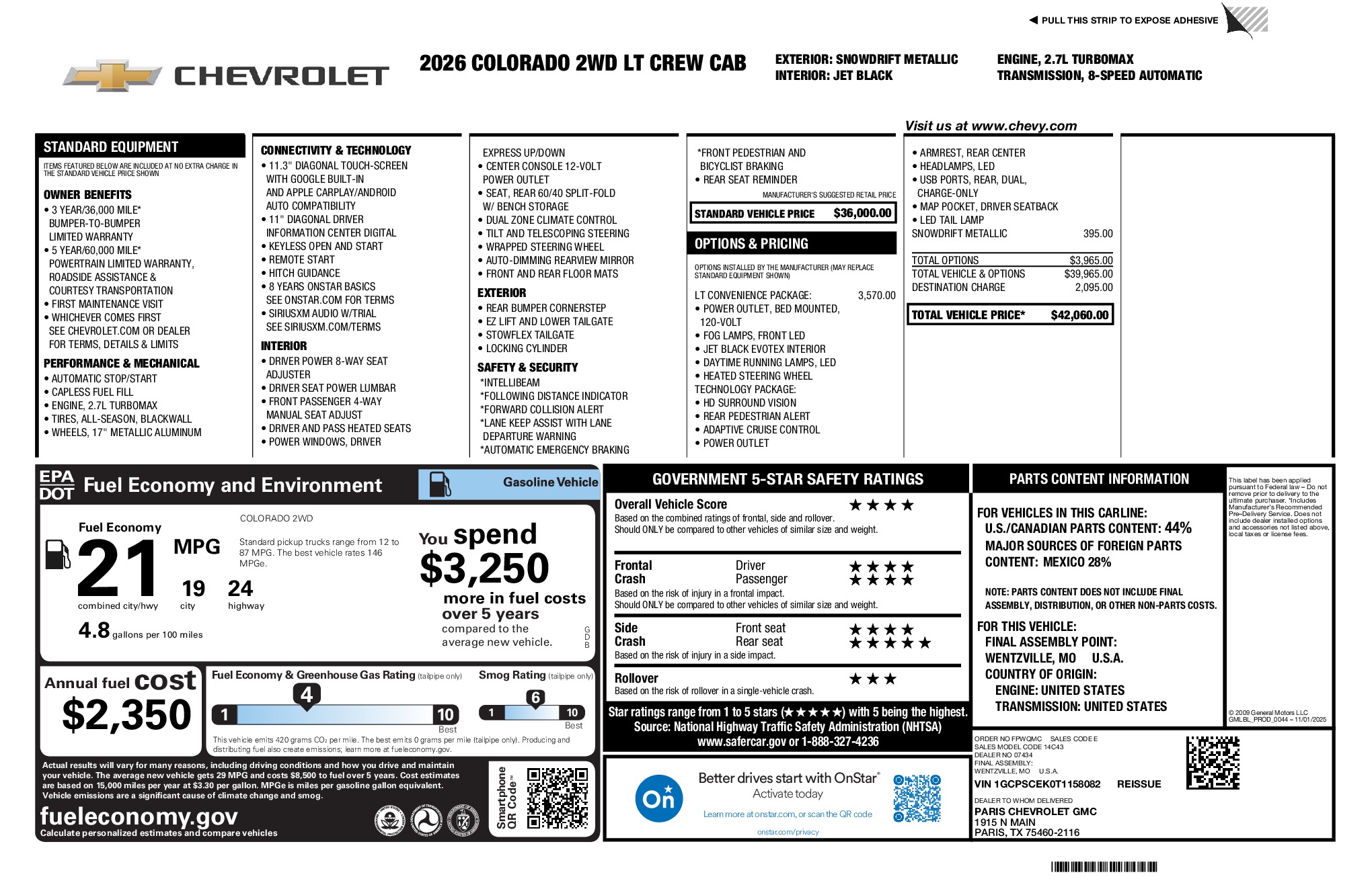 Chevrolet 2026 Colorado LT 2.7L I4 Turbocharged DOHC 16V LEV3-ULEV50 310hp RWD 8-Speed Automatic Snowdrift Metallic