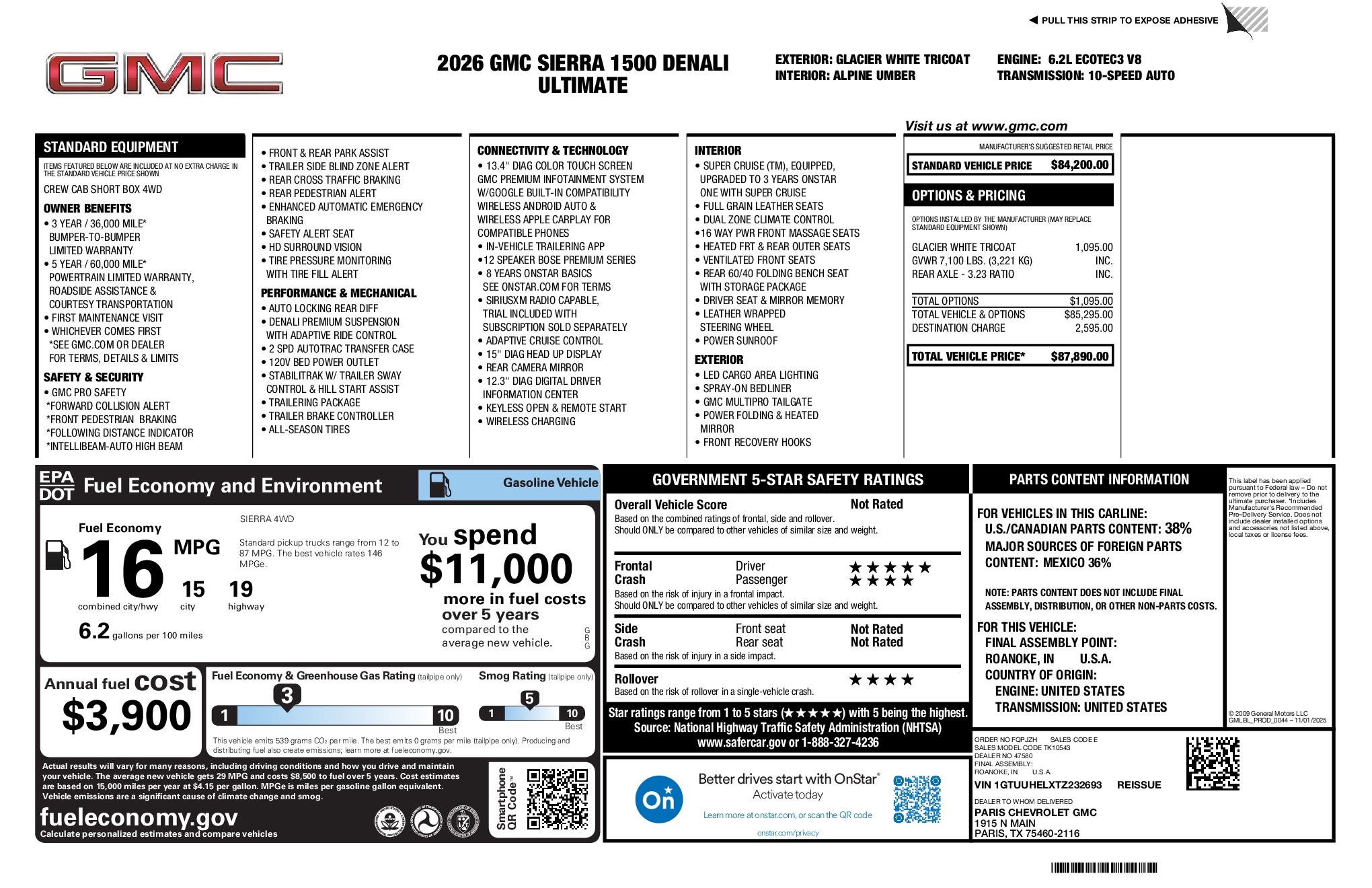 GMC 2026 Sierra 1500 Denali Ultimate EcoTec3 6.2L V8 4WD 10-Speed Automatic Glacier White Tricoat