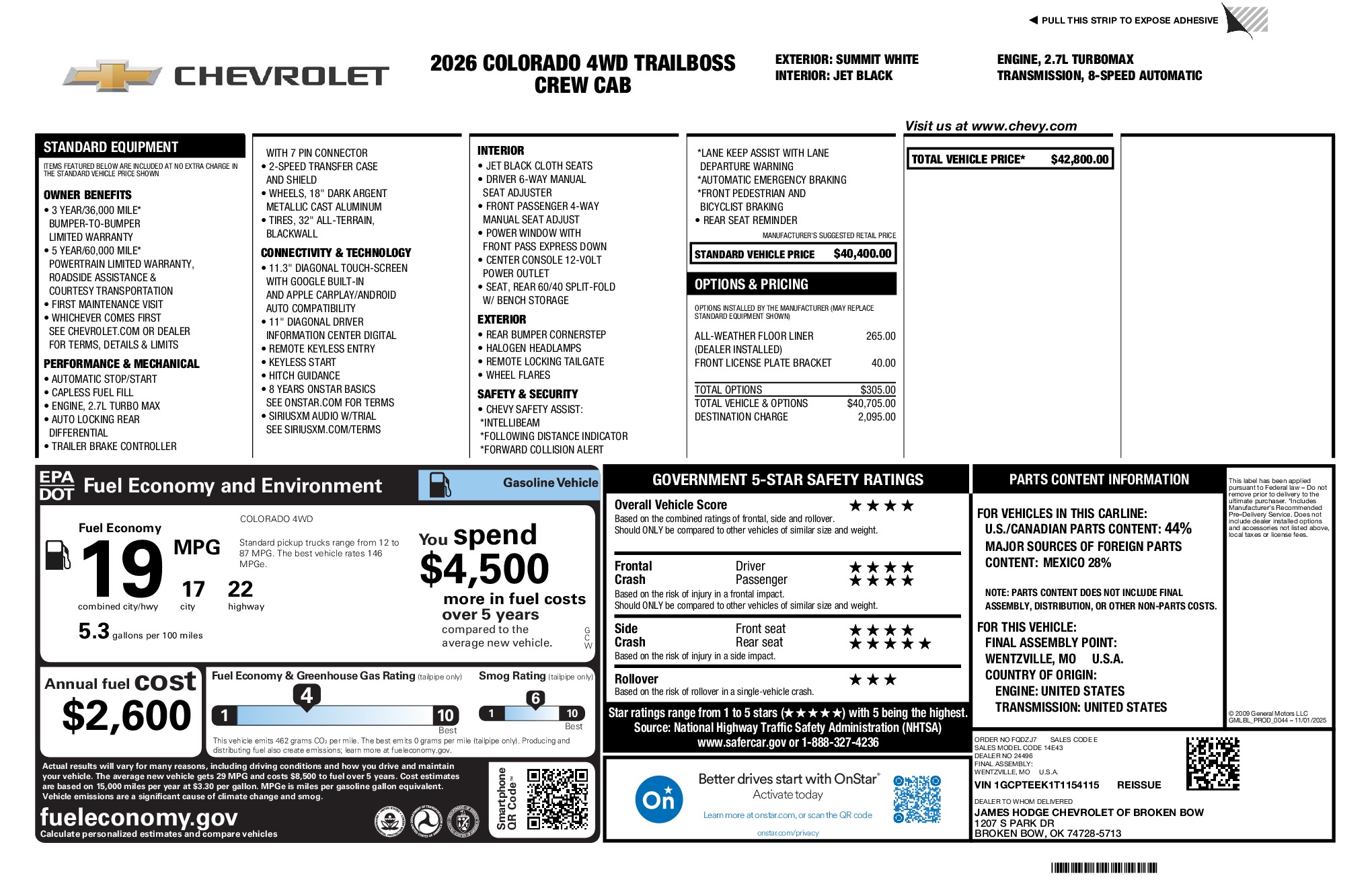 Chevrolet 2026 Colorado Trail Boss 2.7L I4 Turbocharged DOHC 16V LEV3-ULEV50 310hp 4WD 8-Speed Automatic Summit White