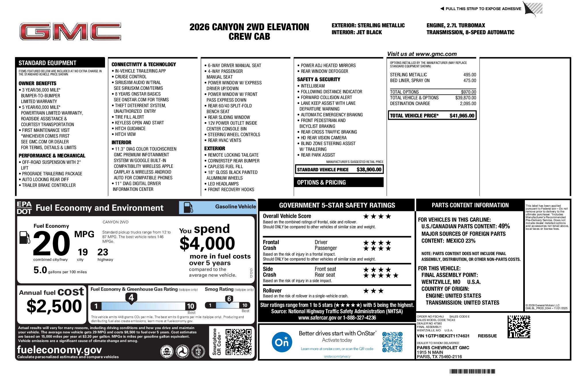 GMC 2026 Canyon Elevation 2.7L I4 Turbocharged DOHC 16V LEV3-SULEV30 310hp RWD 8-Speed Automatic Sterling Metallic