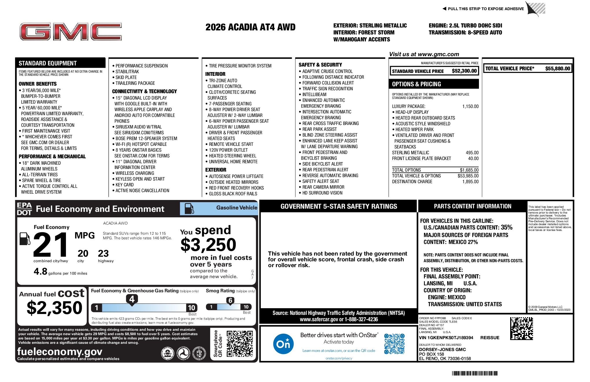 GMC 2026 Acadia AT4 2.5L DOHC AWD 8-Speed Automatic Sterling Metallic