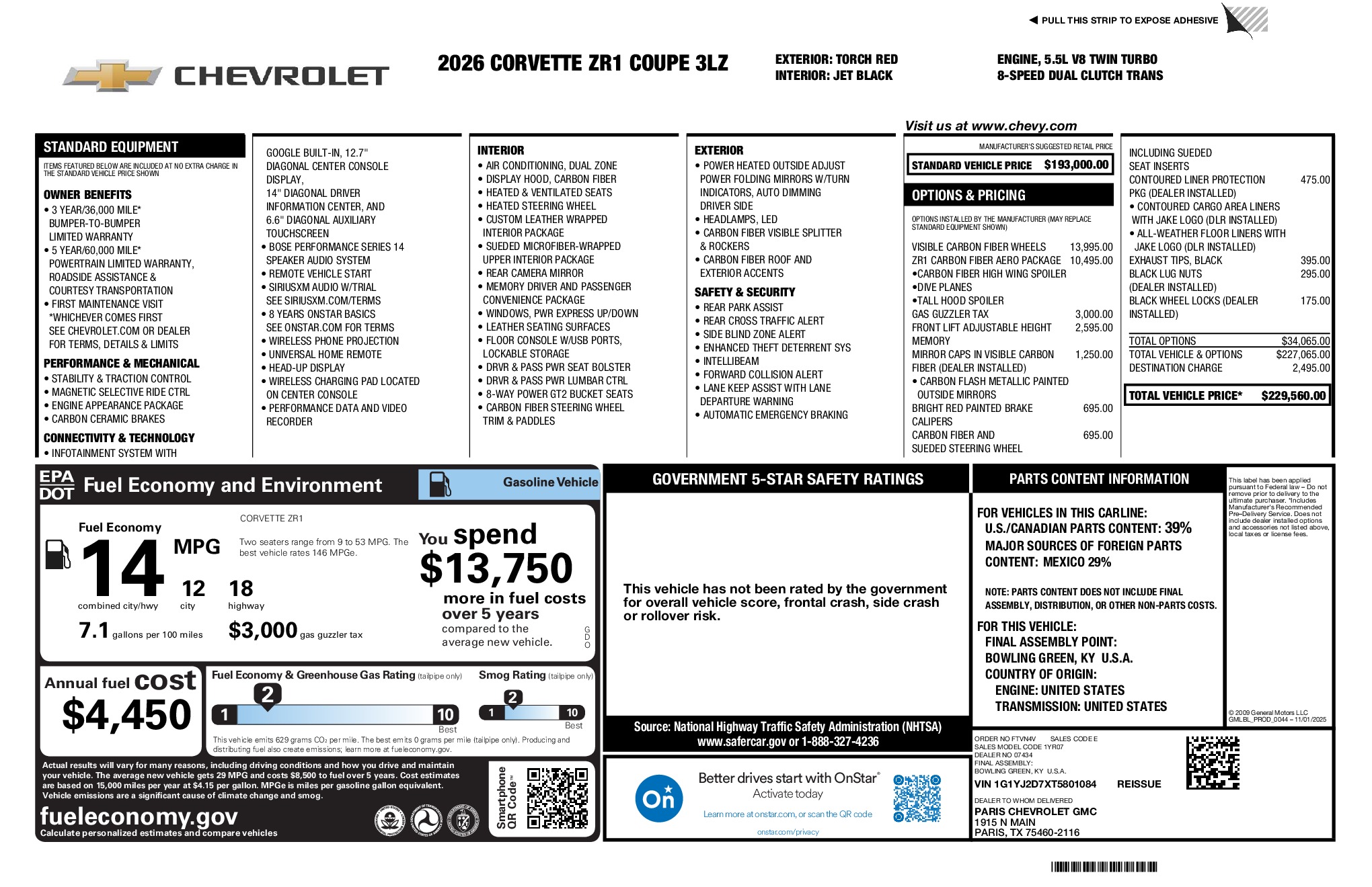 Chevrolet 2026 Corvette ZR1 5.5L V8 RWD 8-Speed Dual Clutch Torch Red