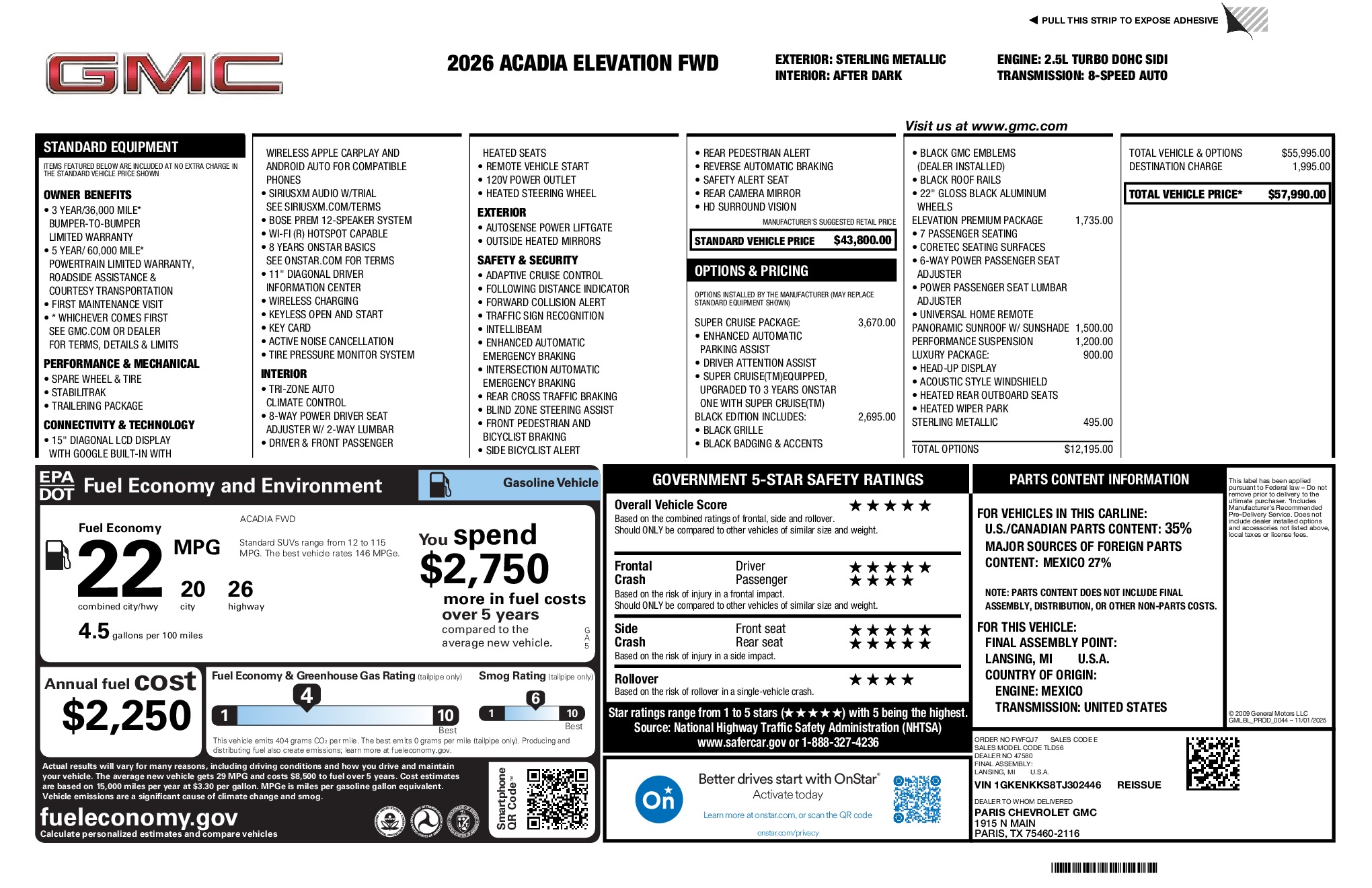 GMC 2026 Acadia Elevation 2.5L DOHC FWD 8-Speed Automatic Sterling Metallic