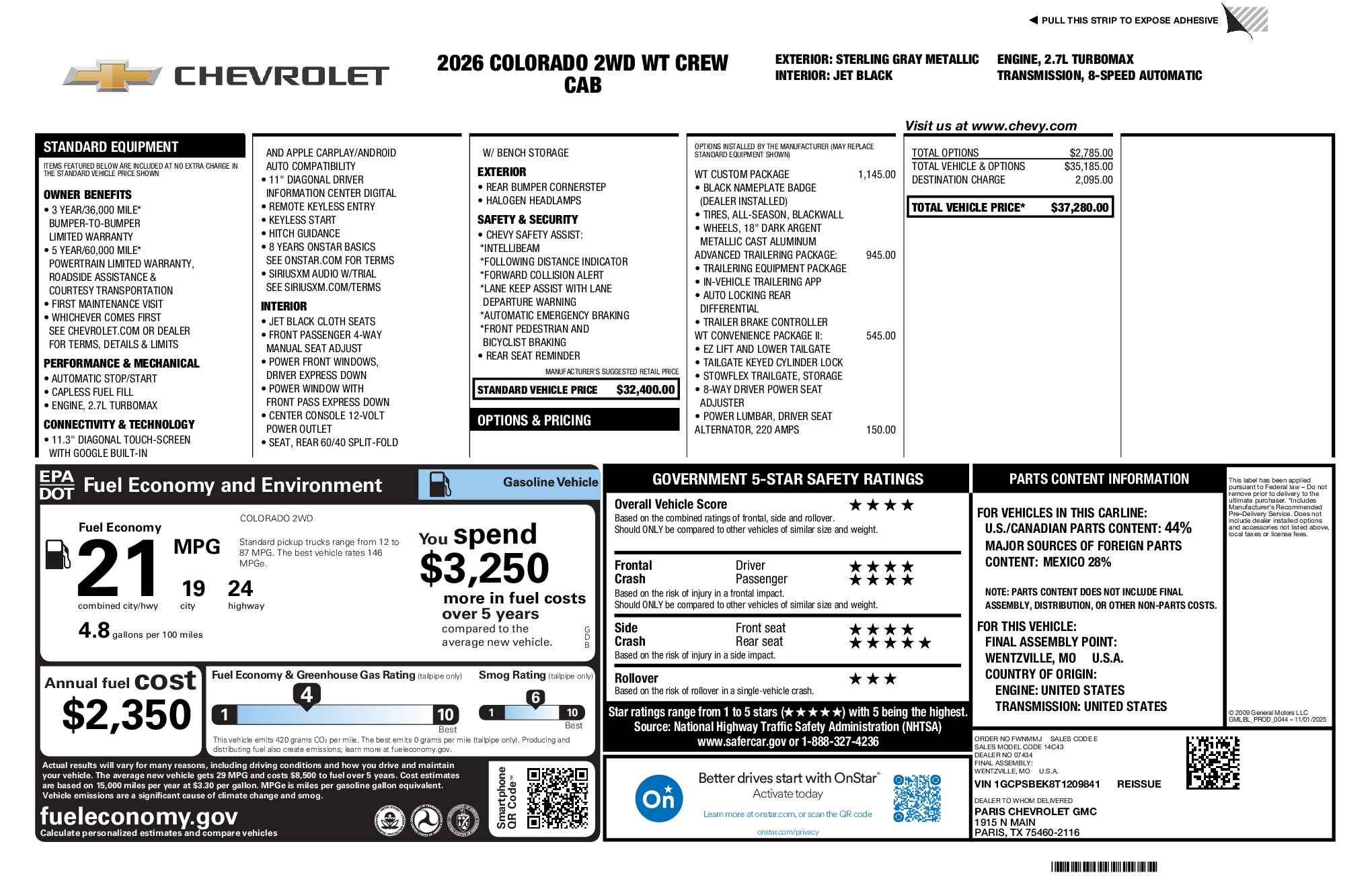 Chevrolet 2026 Colorado Work Truck 2.7L I4 Turbocharged DOHC 16V LEV3-ULEV50 310hp RWD 8-Speed Automatic Sterling Gray Metallic